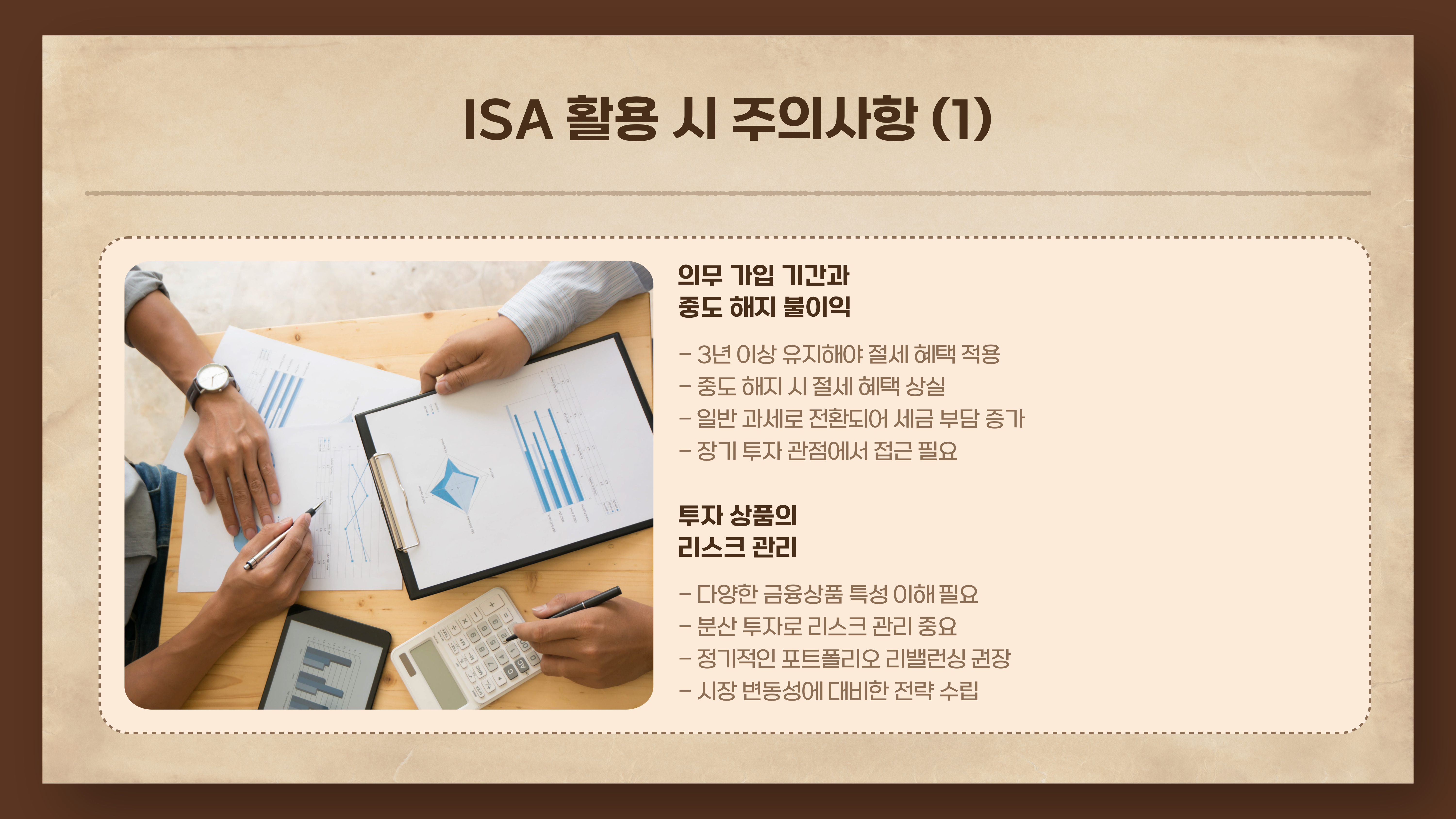 ISA 계좌 활용 시 다음과 같은 사항에 주의해야 합니다: