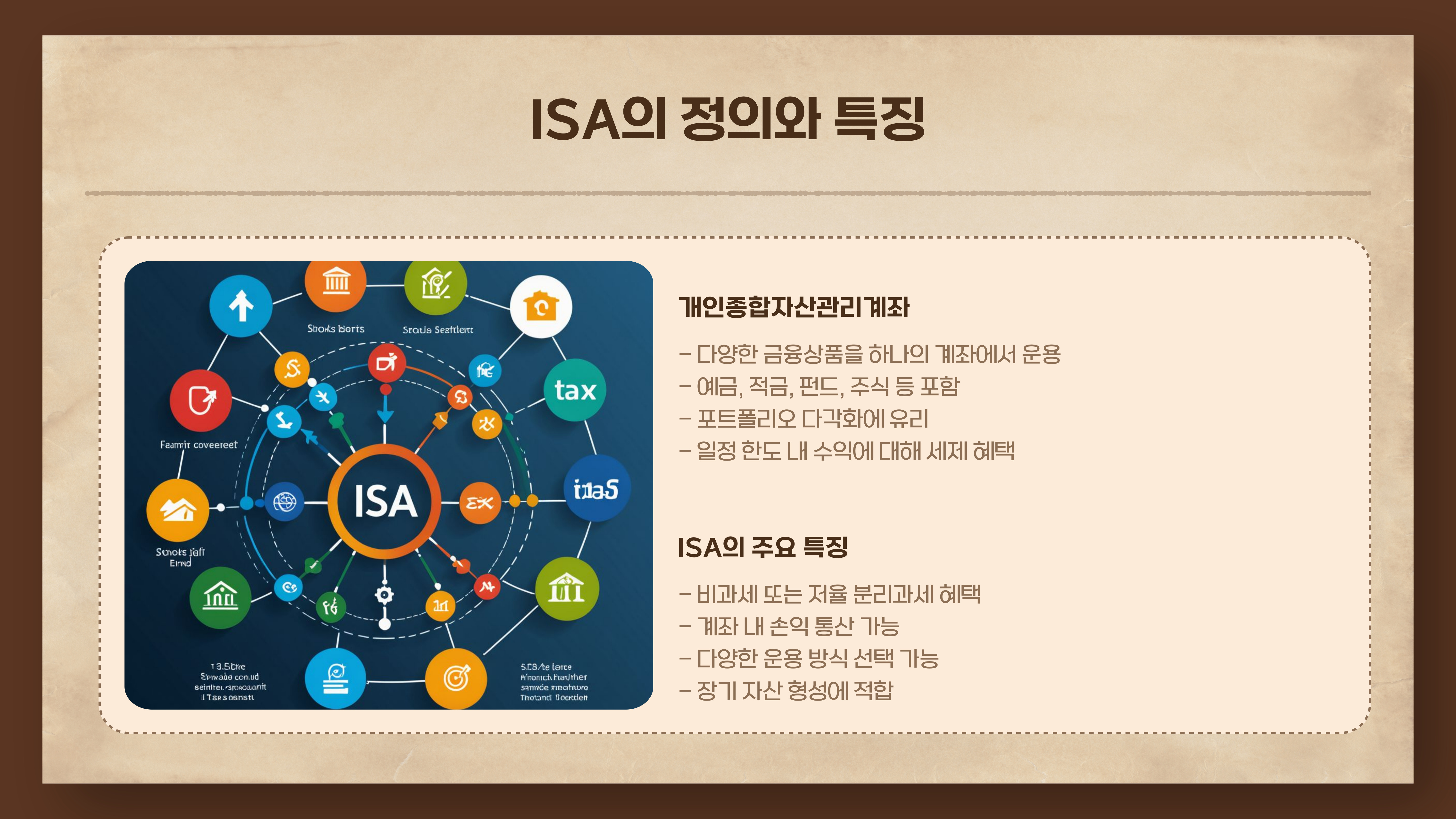 ISA는 다양한 금융상품을 하나의 계좌에서 운용하며, 일정 한도 내 수익에 대해 비과세 또는 저율 분리과세 혜택을 제공하는 금융상품입니다. 예금, 적금, 펀드, 주식 등 다양한 자산에 투자할 수 있어 포트폴리오 다각화에 유리합니다.