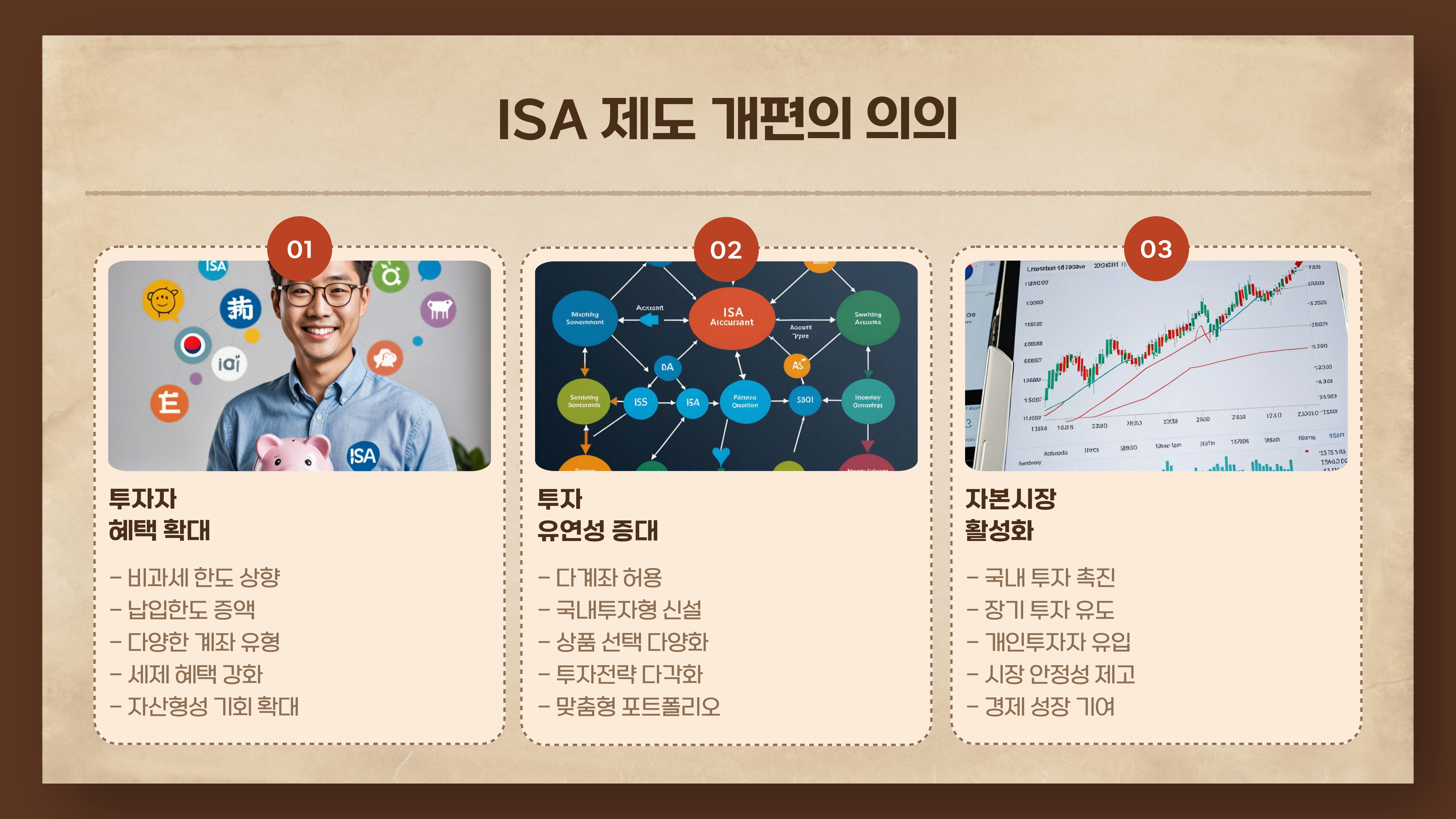 2025년 개편된 ISA 제도는 투자자에게 더 많은 절세 혜택과 투자 유연성을 제공합니다. 자신의 투자 성향과 재무 목표에 맞는 ISA 계좌를 선택하고, 장기적인 관점에서 활용한다면 효과적인 자산 증식이 가능할 것입니다.