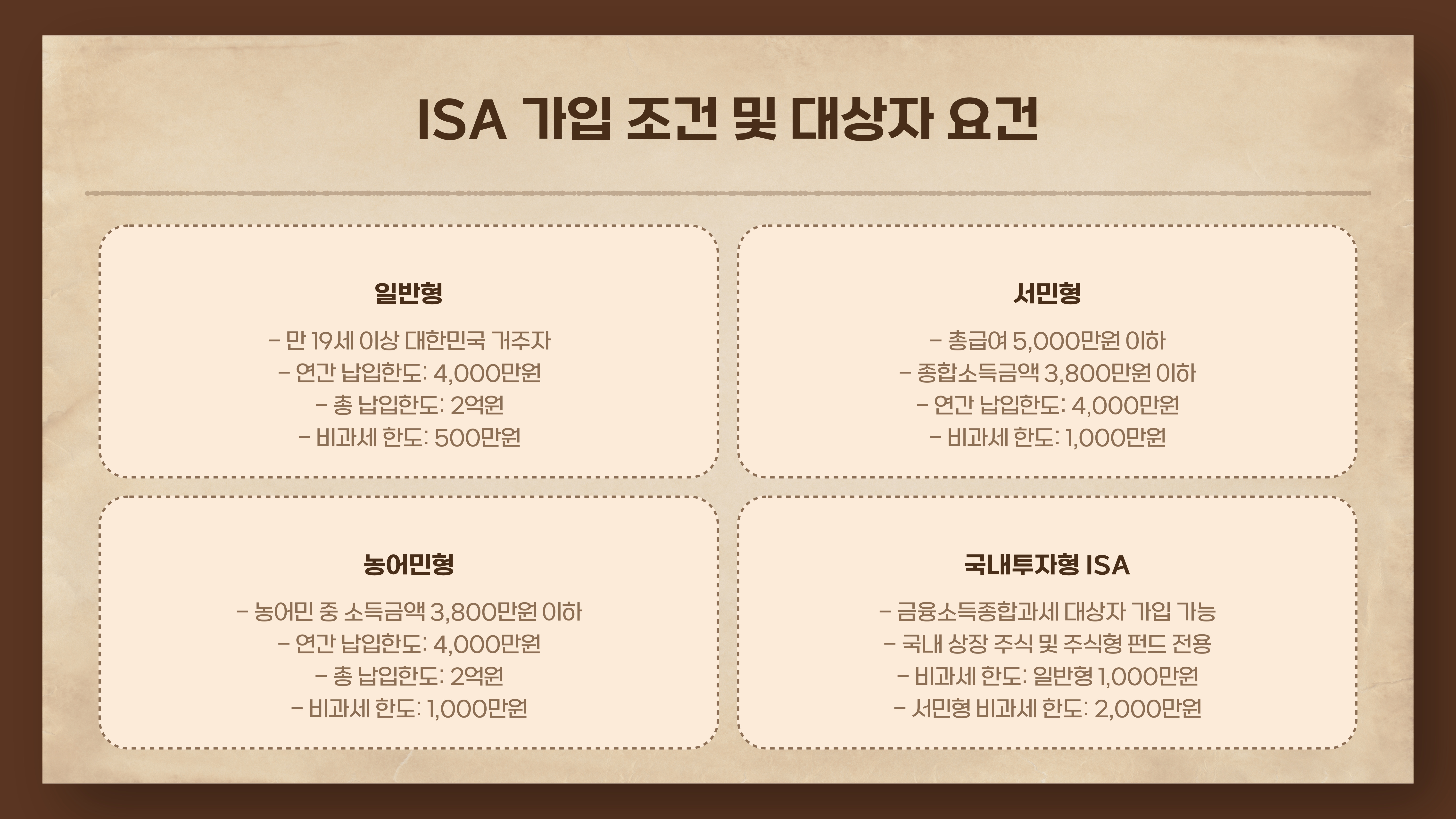 ISA 계좌 가입 조건은 다음과 같습니다: